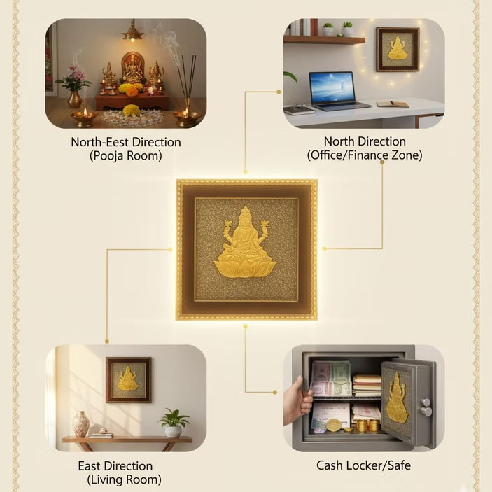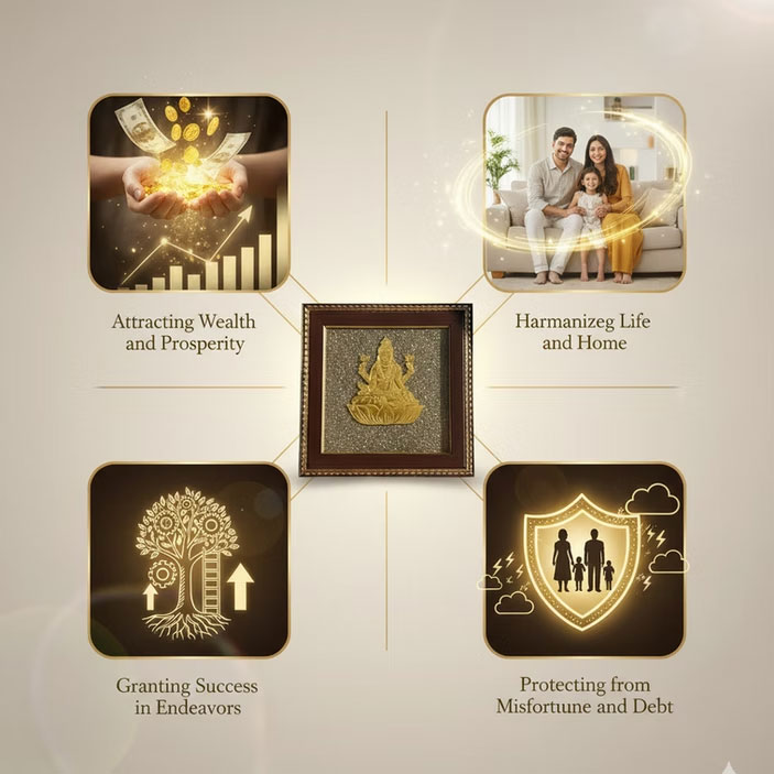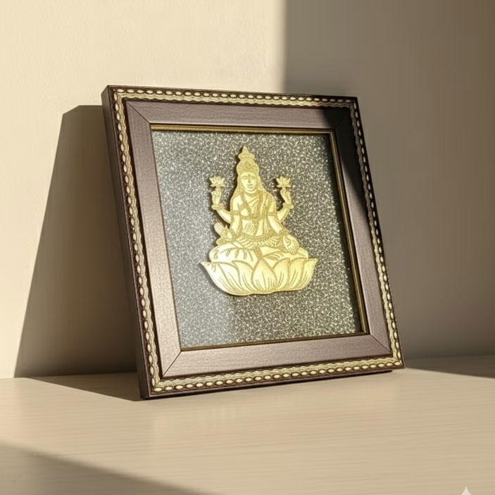 Goddess Lakshmi is the revered Hindu deity of wealth, fortune, power, beauty, and prosperity. Seated on a lotus, she symbolizes purity and spiritual power. Displaying her image is traditionally believed to draw continuous financial and spiritual abundance into the home or business.