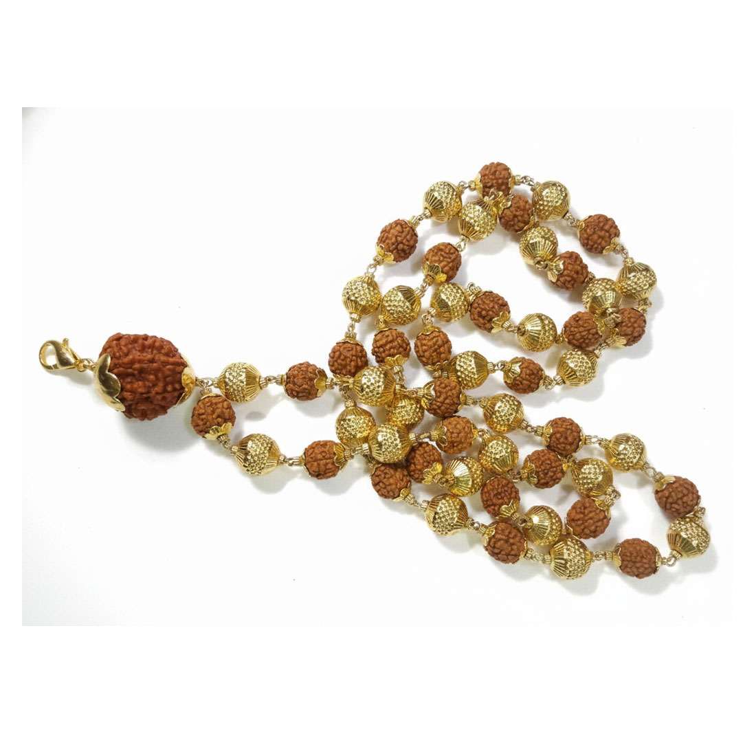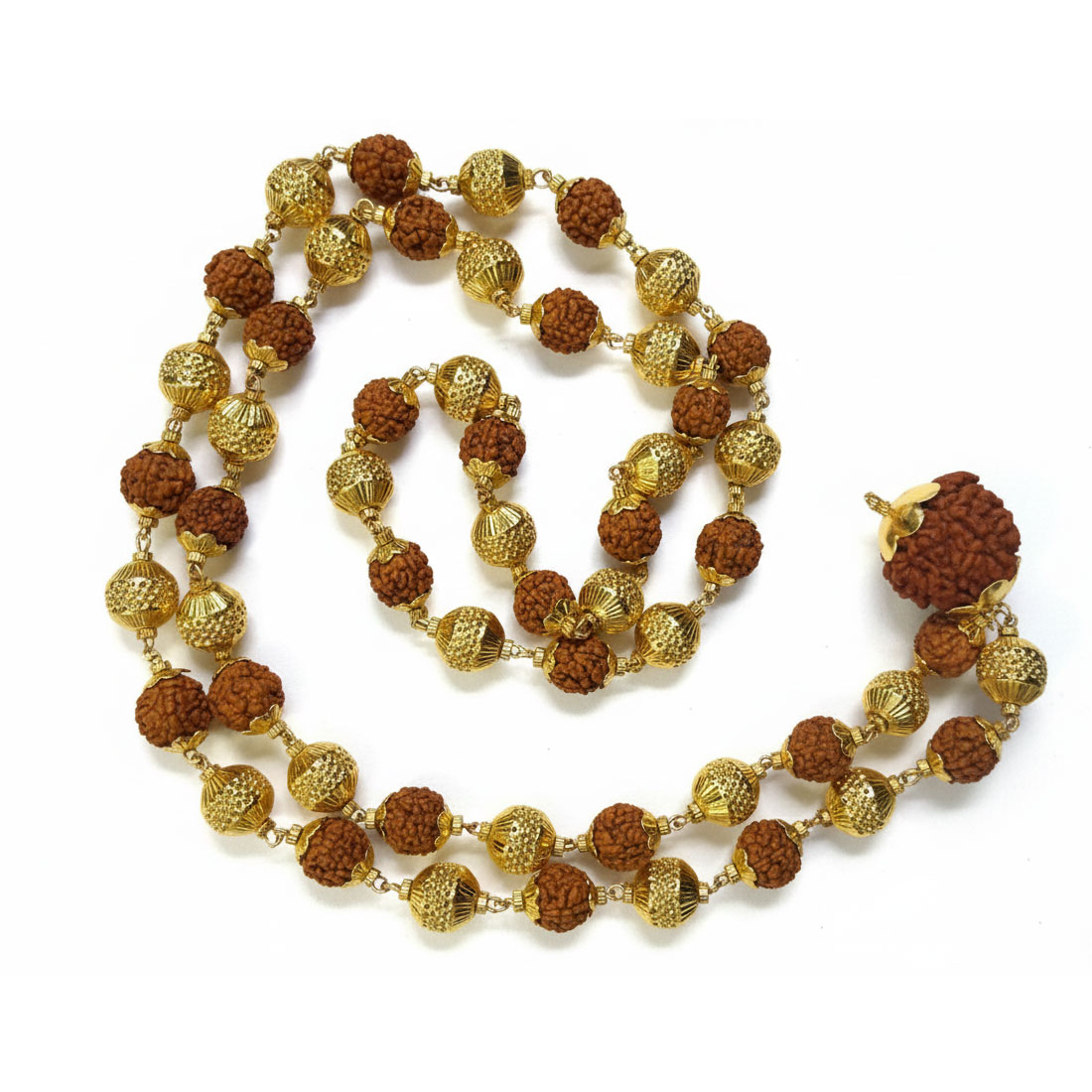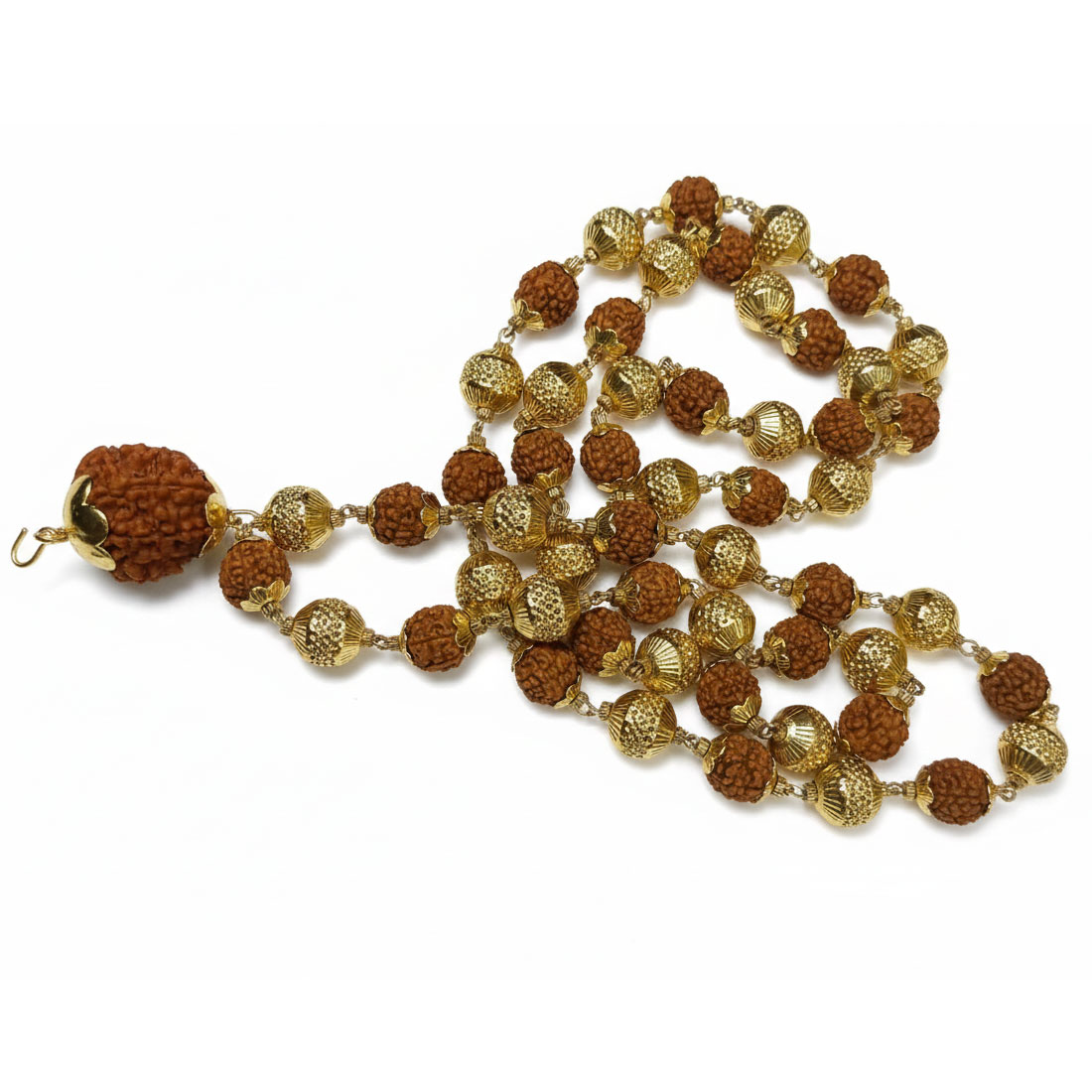 Natural 5 Mukhi Rudraksha Mala with Two 7 Mukhi Beads & 24K Gold-Plated Caps