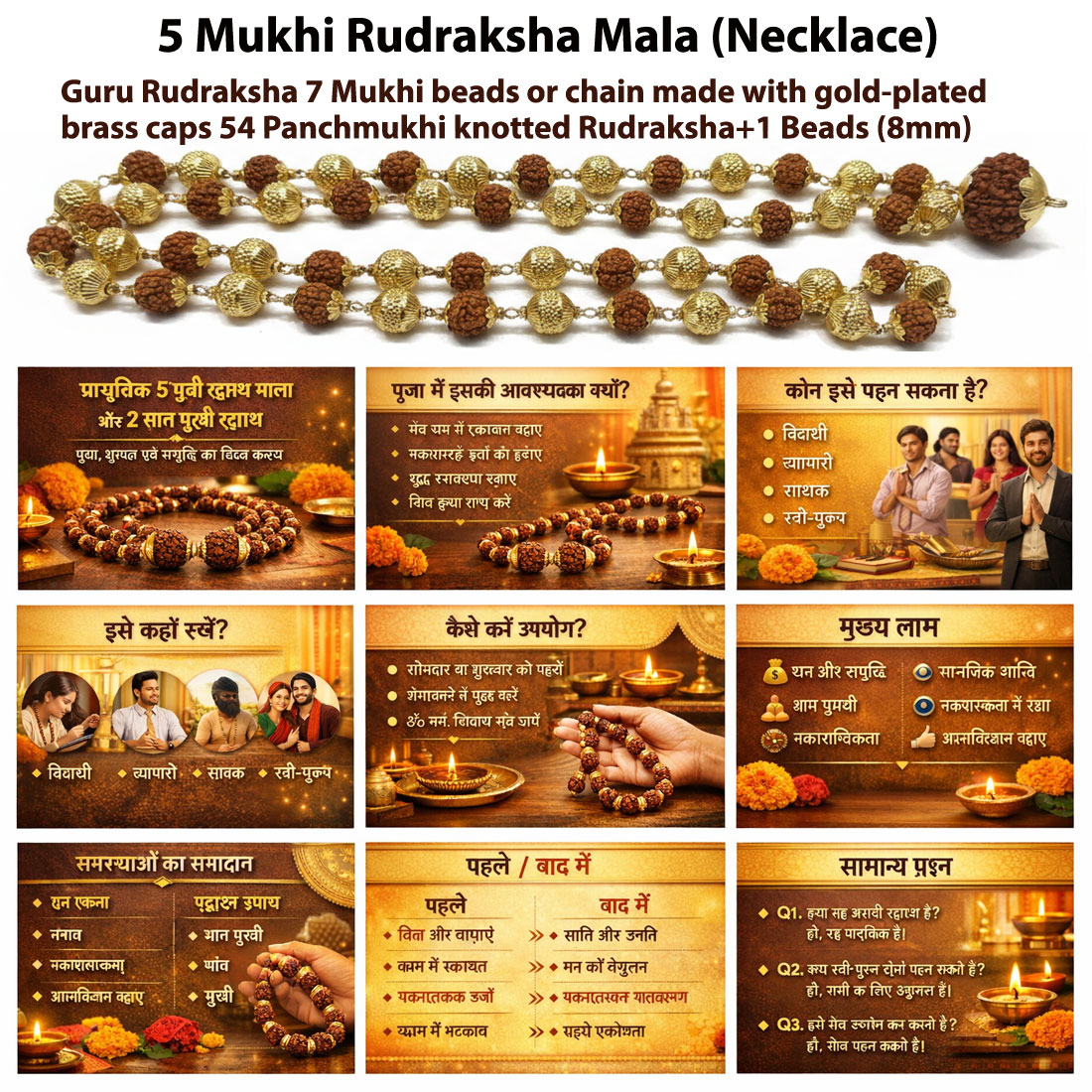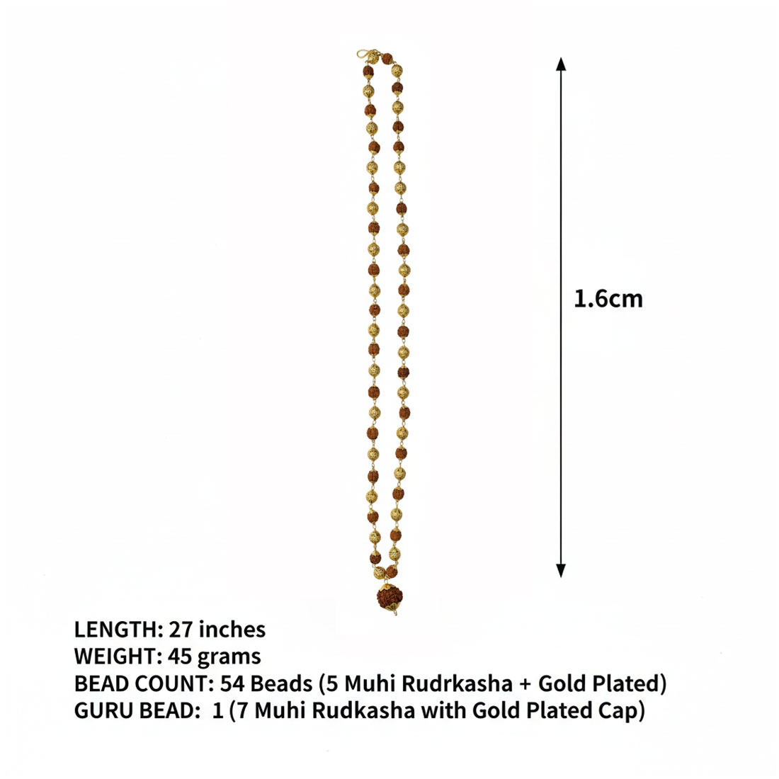 This unique rosary features 54 naturally sourced 5-Mukhi beads known for peace and focus, reinforced with one powerful 7-Mukhi (Saptamukhi) beads to attract wealth and prosperity. Whether used for daily meditation (Japa) or worn as a protective fashion accessory, this mala combines ancient Vedic tradition with high-quality craftsmanship, ensuring a durable gold finish that resists daily wear.