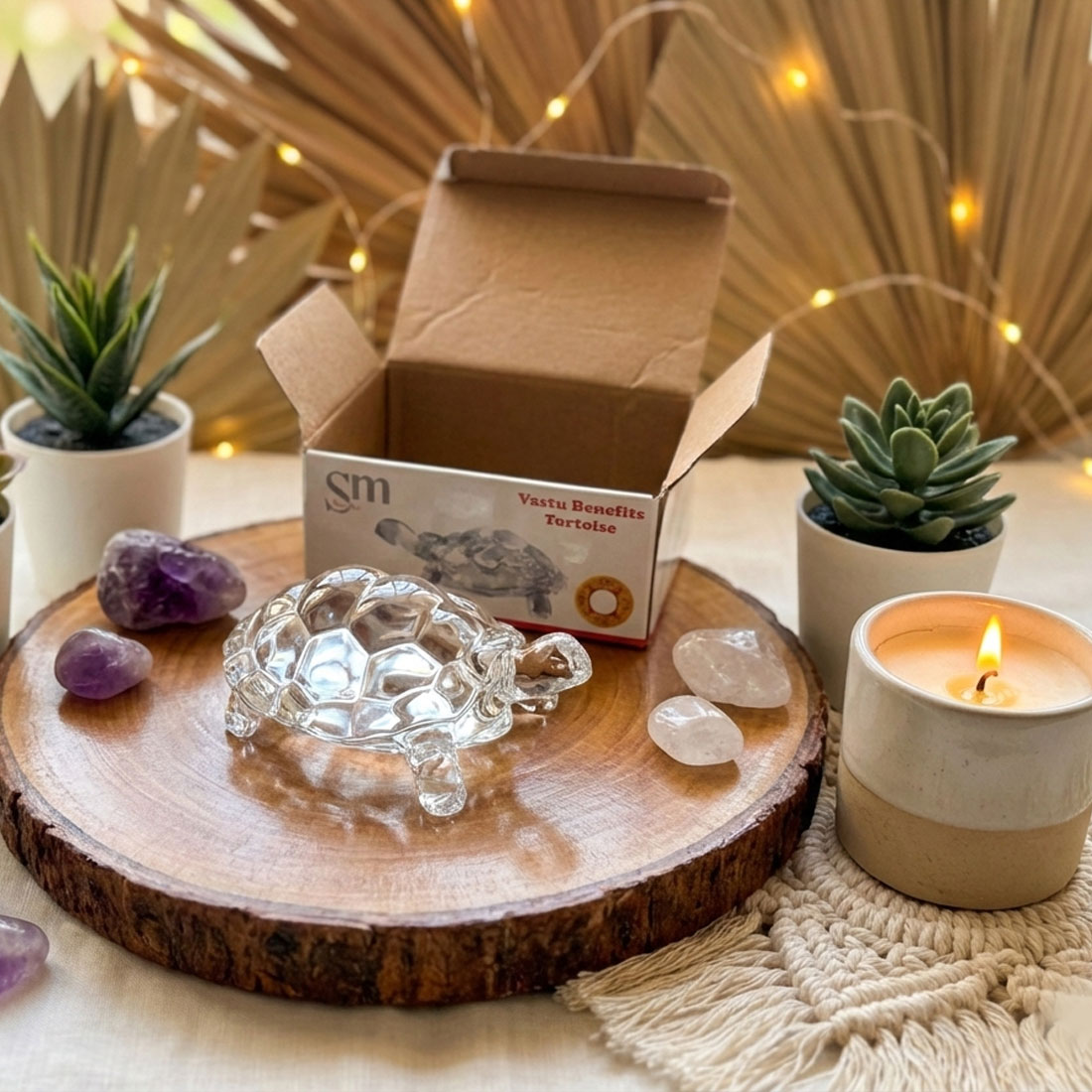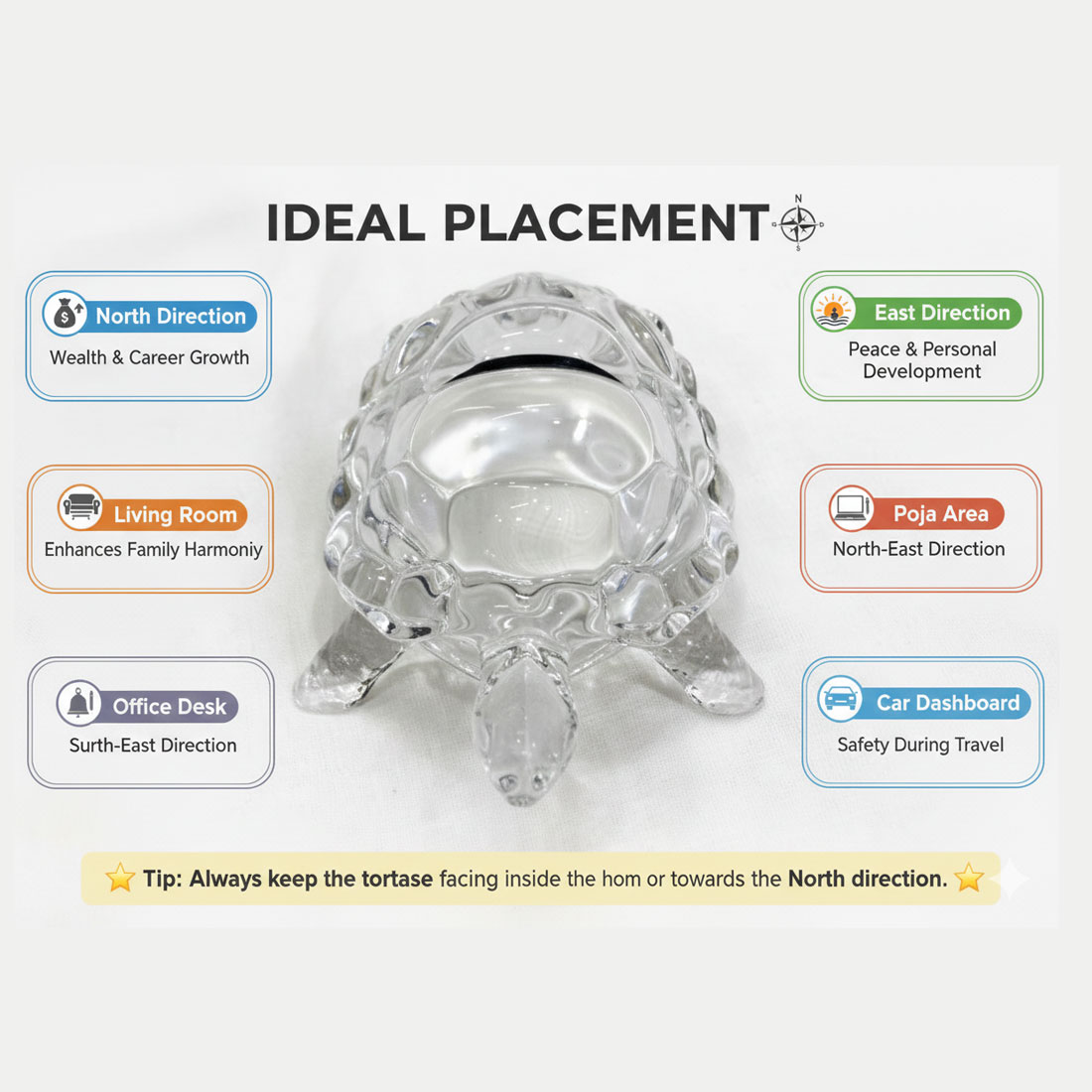 Bring harmony, prosperity and protection into your space with this Clear Crystal Glass Tortoise, a powerful Feng Shui & Vastu symbol of longevity, stability and good fortune. Crafted from premium transparent crystal glass, this elegant showpiece attracts wealth, career growth and positive energy while removing negativity. Ideal for home, office, study table, shop counter or car dashboard, it also makes a meaningful gift for housewarming, Diwali and spiritual occasions. Traditionally used in Vastu Shastra and Feng Shui, the tortoise (Kachua) is a powerful symbol of longevity, stability, and financial abundance. Crafted from premium polished glass, it acts as a magnet for career growth and wealth when placed in the North direction. Whether used as a spiritual remedy or a sophisticated décor piece, it brings serenity and protection to your living space.