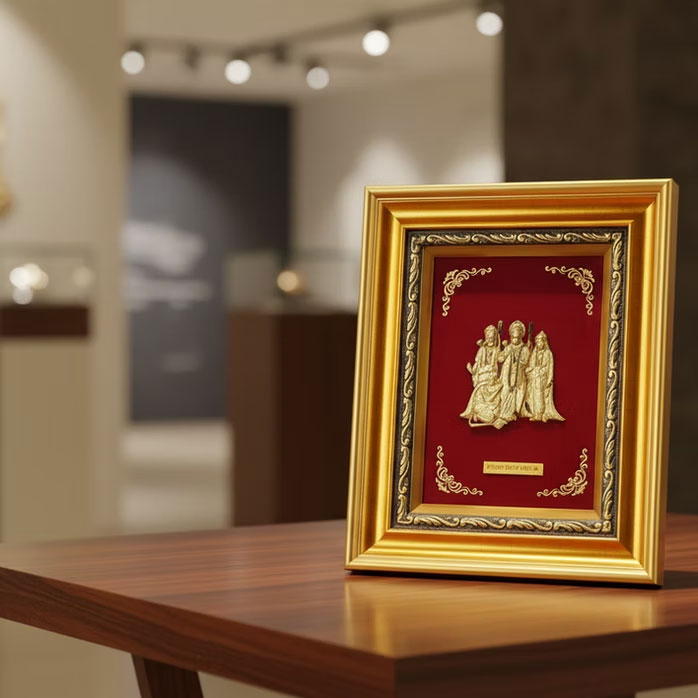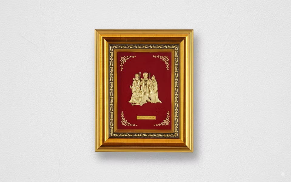 Bring home the blessings of Ayodhya with our exquisite Divine Ram Darbar Golden Embossed Frame. This stunning piece features a finely detailed depiction of Lord Rama, Sita, Lakshmana, and Hanuman, crafted with a beautiful golden embossed finish that radiates spiritual grace.